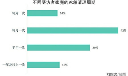 此次网上微调查对受访者冰箱清理周期得出的数据大致呈枣核型:14%的被访者每周清理一次,15%的被访者一年或一年以上才清理一次,每月清理一次和半年清理一次的人数占比分别为42%和29%。
