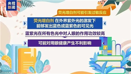 专家提示,荧光增白剂在外界紫外光的激发下,能够发出蓝色或蓝紫色的可见光,但蓝紫光在所有色光中对人眼的作用功效较高,可能对用眼健康产生不利影响。此外,荧光增白剂还可能引发过敏反应。