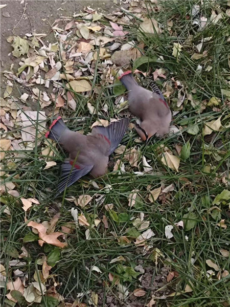 两只撞上场馆玻璃身亡的太平鸟。受访者供图