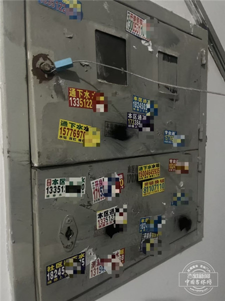 在聚宝家园小区,记者看到,楼道里的电表箱、楼层牌、居民家的门牌号都被层层叠叠的广告覆盖,就连管道上面,居民家张贴的对联上也未能幸免。