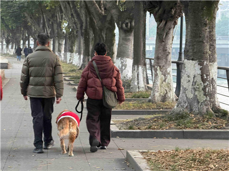 几分钟后,有一对中年人带着一只较大的狗狗从远处走来,狗狗身上套着绳子,由女士拉着狗绳,更考究的是,这一路他们都让狗狗走在两人中间,防止意外情况发生。