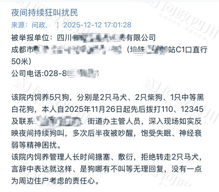 12月12日,在问政平台上,市民投诉四川某公司:院内饲养5只狗,分别是2只马犬、2只柴狗、1只中等黑白花狗,夜间持续狗叫,自己多次后半夜被吵醒,饱受失眠、神经衰弱等精神困扰。而饲养管理人长时间搪塞、敷衍,拒绝转走2只马犬,还说“狗哪有不叫的”,没有一点为周边住户考虑的责任心。
