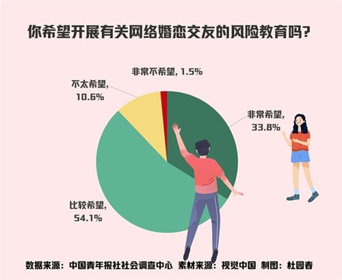 调查中,87.9%的受访单身青年希望开展有关网络婚恋交友的风险教育,其中33.8%的受访单身青年表示非常希望。
